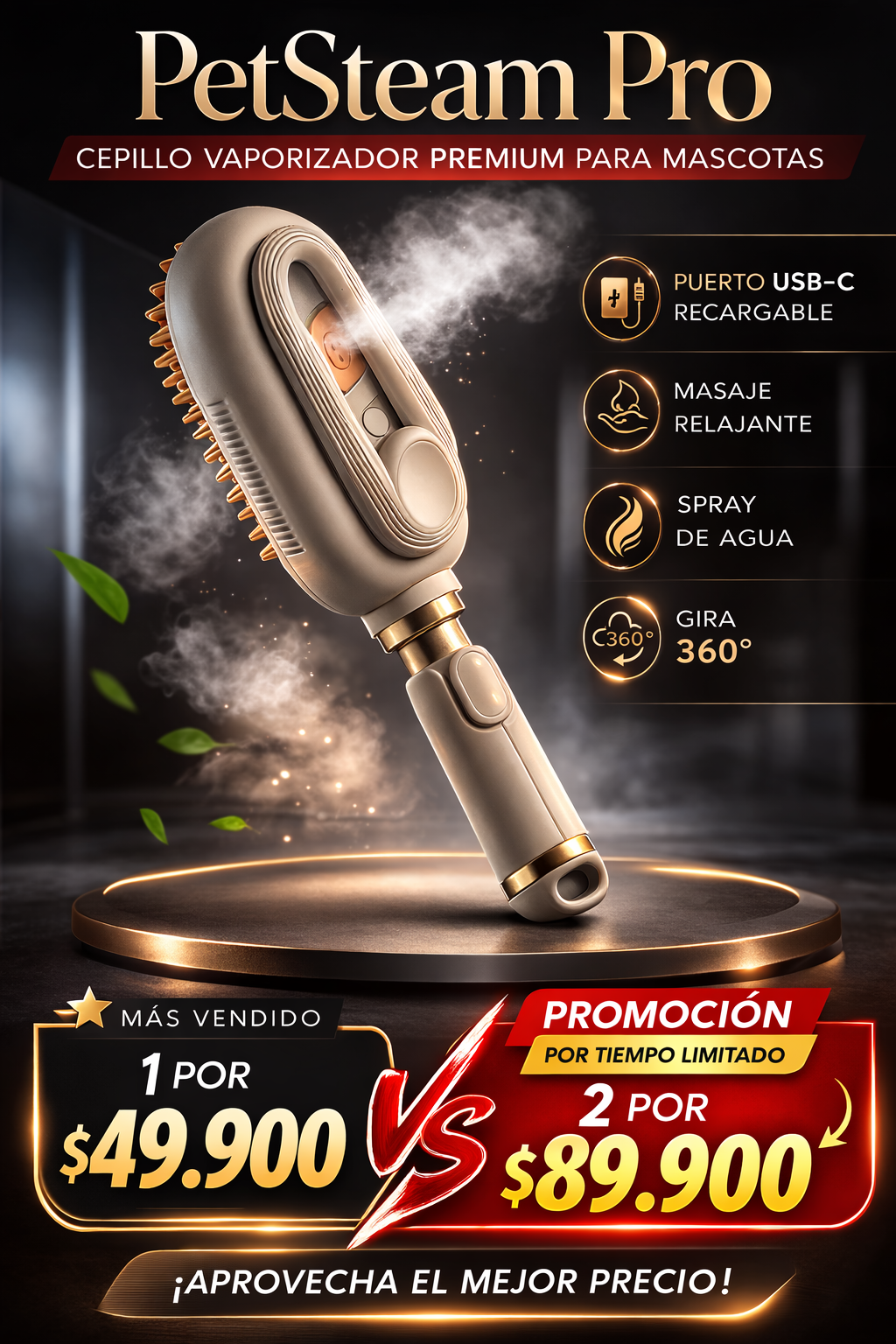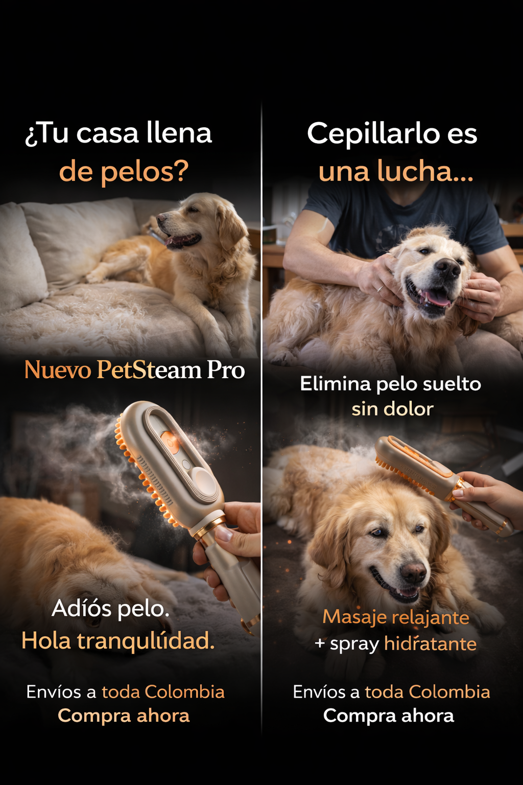 🐶 Elimina pelo suelto y nudos fácilmente 💧 Vaporizador integrado que hidrata el pelaje ✨ Deja el pelaje más suave y brillante 🧼 Reduce el pelo en muebles y ropa 🐾 Masajea a tu mascota mientras la cepillas